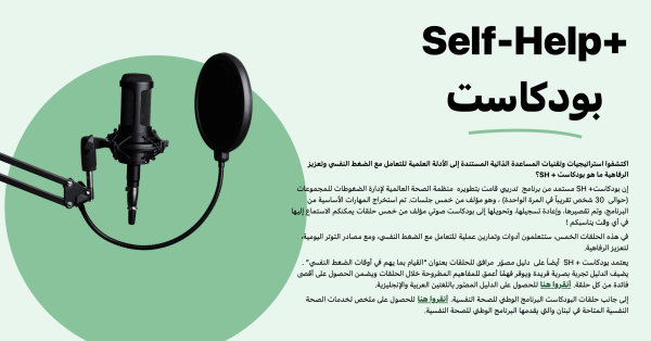 بودكاست +Self-Help يتألف من حلقات صوتية قصيرة تم تطويرها استناداً إلى برنامج تدريبي أعدته منظمة الصحة العالمية لإدارة الضغط المجتمعي. كل حلقة تزوّدك بأدوات وتمارين عملية للتعامل مع الضغط النفسي وروتين الحياة اليومية لتعزيز الرفاهية.