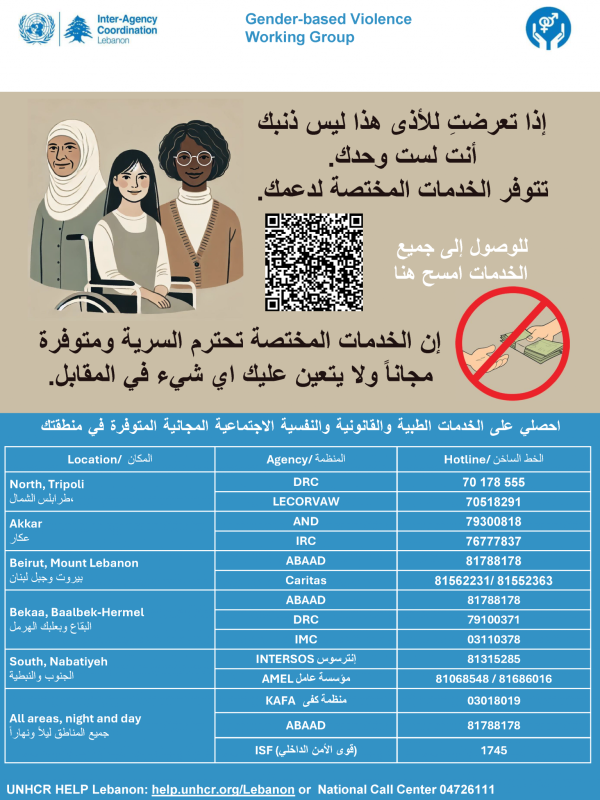 This UNHCR Lebanon resource defines gender-based violence and is accompanied by an awareness infographic showing the locations and services available for survivors, including legal aid, medical care, and psychosocial support, as well as hotlines and the relevant organizations providing these services.