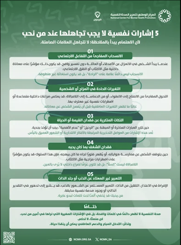 إنفوجرافيك توعوي من المركز الوطني لتعزيز الصحة النفسية يوضح خمس علامات نفسية مقلقة لا يجب تجاهلها عند الأحبة. تشمل هذه العلامات الانسحاب المفاجئ من التفاعل الاجتماعي، التغيرات الحادة في المزاج أو الشخصية، العبارات المتكررة عن فقدان القيمة أو الرغبة في الحياة، فقدان الشغف بالأنشطة أو الهوايات السابقة، والتعبير المستمر عن الذنب أو جلد الذات. يهدف الإنفوغرافيك إلى تنبيه الأفراد لأهمية الملاحظة المبكرة لهذه الإشارات، والتأكيد على أن التدخل العاطفي والدعم النفسي يمكن أن ينقذا حياة.