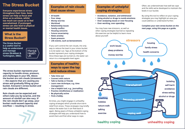 A visual and reflective tool to help people understand how stress builds up (“stressors” = what fills the bucket) and what coping strategies (healthy or unhealthy) act like taps to reduce the level. It guides users to list their own stressors, healthy coping methods, unhelpful coping behaviours, and signs that their stress is reaching capacity. Emphasises that stress, when unchecked, can lead to overwhelm and that actively using coping taps and reaching out for support can help.