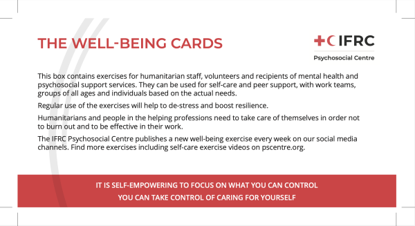 بطاقات الرفاه النفسي هي مجموعة من البطاقات التفاعلية القابلة للطباعة صُمِّمت لدعم الأفراد في الأوقات الضاغطة. يظهر على وجه كل بطاقة الهدف المنشود (مثل: “عندما تريد التهدئة”)، بينما يوضّح ظهر البطاقة الإجراءات والتمارين اللازمة لتحقيق هذا الهدف. أُعدّت كأدوات عملية للعناية الذاتية والدعم بين الأقران، وهي مناسبة للعاملين في المجال الإنساني، المتطوعين، المجموعات بمختلف الأعمار، أو الأفراد الذين يتلقون دعماً نفسياً اجتماعياً. تتضمّن البطاقات ممارسات قصيرة مثل التأريض، تمارين التنفّس، أساليب الاسترخاء، وأنشطة تقوّي الموارد الداخلية. ومن خلال تشجيع حرية الاختيار والوعي والتكييف، تساعد هذه البطاقات على تقليل الضيق، بناء المرونة، تنظيم العواطف، وتعزيز الرفاه بشكل عام.