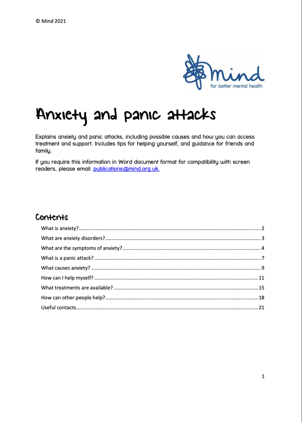 This guide explains what anxiety and panic attacks are, their possible causes, symptoms, and available treatments. It also provides self-help strategies and advice for family and friends on how to support someone experiencing anxiety.