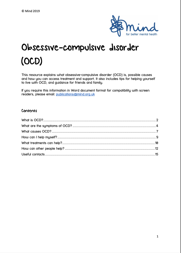 This resource explains what Obsessive-Compulsive Disorder (OCD) is, including its obsessions and compulsions, possible causes, and what treatments are available. It also gives advice on how to live with OCD, tips to help yourself, and guidance for friends and family.