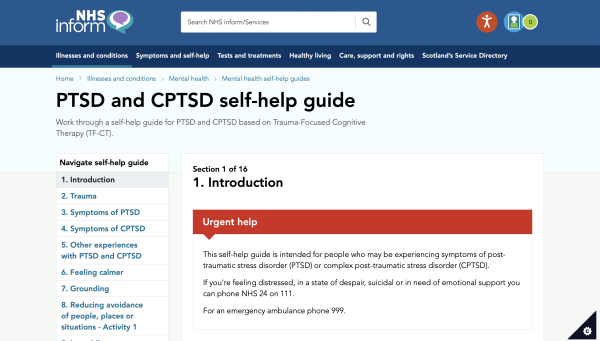 This is an interactive self-help guide by NHS Inform designed for people experiencing symptoms of PTSD or Complex PTSD. It provides understanding of what PTSD and CPTSD are, suggests practical strategies and tools based on trauma-focused therapy, helps with symptom management, and supports well-being through self-care. It is intended for mild to moderate cases and is not a substitute for professional therapy but aims to help improve quality of life by giving people options to help themselves.
