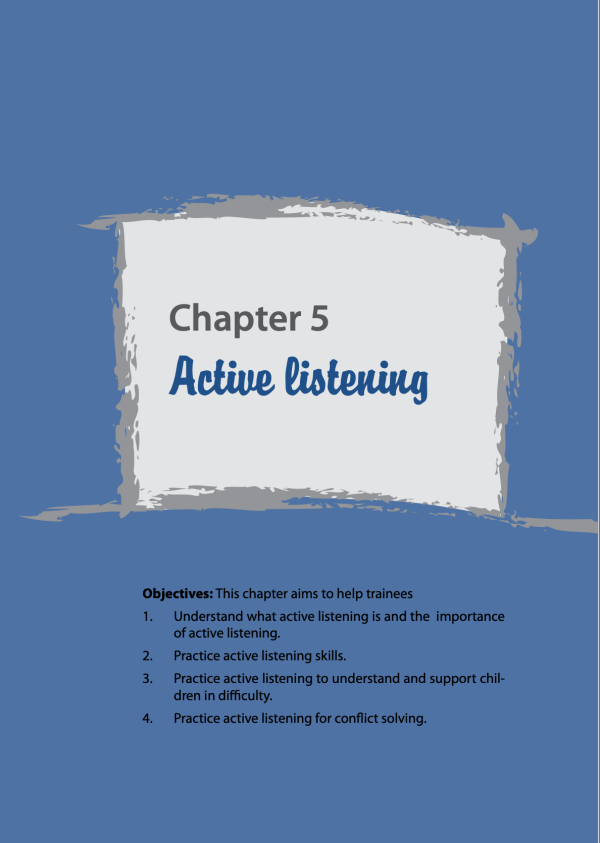 Designed to help caregivers, teachers, and others working with children improve how they listen and respond, this chapter explains what active listening is and why it matters. It teaches practical active listening skills, including reflecting both the content and the feelings of children, validating emotions, offering encouragement, and helping children find solutions. It also shows how active listening can support children in emotional distress, be used in conflict resolution, and strengthen the bond between adult and child. The chapter includes guided activities focused on practising listening in difficult situations, overcoming barriers to listening, and solving conflicts through structured steps.