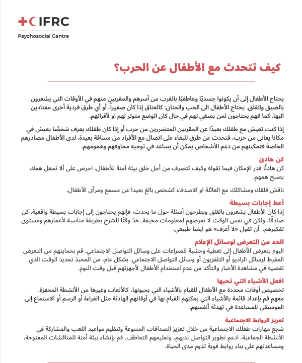 هذا الدليل يقدّم لمقدّمي الرعاية نصائح عملية حول كيفية التحدث مع الأطفال عن الحرب. يركّز على أهمية توفير القرب الجسدي والعاطفي، الإصغاء بصبر، وخلق بيئة آمنة من خلال الحفاظ على الهدوء. يشجّع على تقديم إجابات بسيطة وصادقة لأسئلة الأطفال، والحد من تعرضهم لوسائل الإعلام المقلقة، ومساعدتهم على مواجهة المخاوف من خلال أنشطة إيجابية. كما يبرز أهمية الروابط الاجتماعية، التعاطف، والمناقشات المفتوحة كوسائل لتعزيز المرونة ودعم الأطفال أثناء النزاع والنزوح
