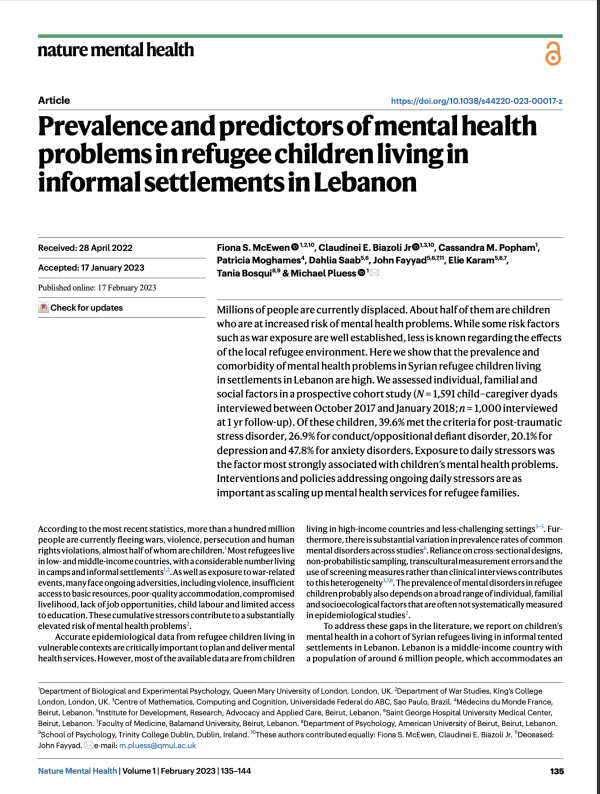 تُجري هذه الدراسة من لبنان تحليلاً لاكتشاف مدى انتشار ومُنبّئات مشاكل الصحة النفسية لدى الأطفال السوريين اللاجئين المقيمين في تجمعات غير رسمية (خيام/مخيمات). شملت الدراسة 1,591 ثنائي طفل-مُعيل عند الخطّ الأساسي، وتتبّع 1,000 منهم بعد عام. وأسفرت النتائج عن نسب مرتفعة تقريباً: حوالي 39.6٪ لاضطراب ما بعد الصدمة، 47.8٪ لاضطرابات القلق، 20.1٪ للاكتئاب الرئيسي، و26.9٪ لاضطراب السلوك / المعارضة. كان العامل الأقوى المؤشّر لمشاكل الصحة النفسية هو جودة بيئة اللجوء (مثل ظروف السكن، الوصول للخدمات، الدعم المجتمعي) بدلاً من التعرض للحرب أو العوامل الفردية/الأُسرية. تؤكد الدراسة على أن معالجة الضغوط اليومية وبيئة اللجوء قد تكون بنفس أهمية توسيع خدمات الصحة النفسية للأطفال المشردين.