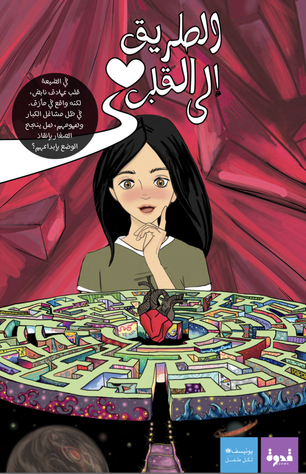 الطريق إلى القلب كتاب مصوّر يروي قصة ماي، مراهقة شغوفة بالعلوم والتجارب العلمية، تحاول إقناع والديها بأهمية اهتماماتها. تفاجأت ماي عندما علمت أن أهلها يخططون لزواجها من وسيم، فتقرر خوض مغامرة مع أصدقائها لإقناع والديها بالإصغاء لها. يستهدف الكتاب المراهقين والمراهقات بين ١١ و١٩ عامًا ومقدمي الرعاية والأهل، ويسعى إلى تسليط الضوء على قضية الزواج المبكر وأهمية تمكين الفتيات من تحقيق ذواتهن وإمكاناتهن قبل تحمّل مسؤوليات الزواج.