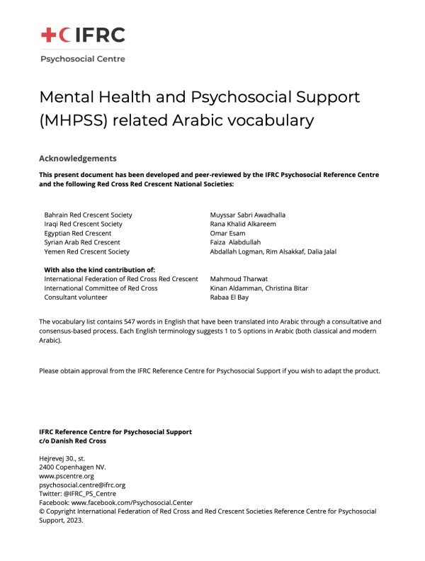 يحتوي هذا المرجع على قائمة تضم 547 مصطلحًا في مجال الصحة النفسية والدعم النفسي الاجتماعي مترجَمة من الإنجليزية إلى العربية. تم تطويره من خلال عملية تشاورية قائمة على التوافق، مع تقديم خيارات ترجمة لكل مصطلح، وذلك لتعزيز توحيد المفاهيم واللغة المستخدمة في قطاع الصحة النفسية والدعم النفسي الاجتماعي.