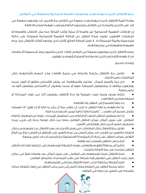 تقدّم هذه النشرة من يونسف لبنان توصيات مختصرة وفعّالة لدعم إدماج الأطفال الذين يعانون من التوحد، أو الصعوبات النفسية الاجتماعية، أو صعوبات التواصل. تركز على أهمية استخدام وسائل اتصال مناسبة، دعم الاحتياجات النفسية، وتعزيز فهم العاملين لخصائص هذه الفئات. كما تحثّ على تكييف الأنشطة البيئية والتعليمية لتمكين الأطفال من المشاركة الفاعلة ضمن برامج المجتمع والإجراءات الإنسانية.