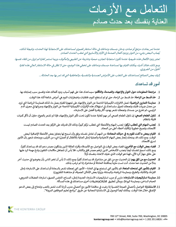 تقدم هذه النشرة إرشادات عملية للعناية بالنفس بعد التعرض لحدث صادم. تشرح أن الجسم والعقل يدخلان في حالة «إنذار مرتفع» كرد فعل طبيعي، وتشير بشكل عام إلى مواضيع مثل: أمور قد تساعدك في التخفيف من التوتر، ما يُستحسن تجنبه بعد الصدمة، واستراتيجيات بسيطة لتحسين الشعور عندما ينتابك التعب أو الضيق أو الاستياء. كما تتضمن نصائح حول الراحة، ممارسة النشاط البدني، العودة إلى الروتين، التواصل مع الآخرين، استخدام تقنيات الاسترخاء، وطلب الدعم المهني عند الحاجة.