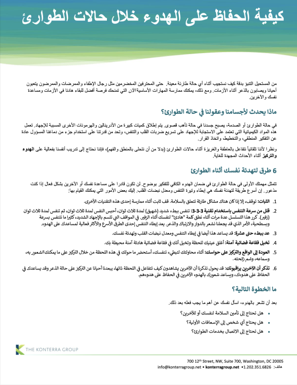 توضح هذه النشرة  كيف يستجيب الجسد والعقل للطوارئ من خلال حالة تأهب قد تعيق التفكير الواضح واتخاذ القرار. وتُبرز أهمية تهدئة النفس والتحكم بالاستجابات كخطوة أساسية للتعامل مع الموقف بفعالية. كما تتناول بشكل عام محاور رئيسية هي: طرق لتهدئة نفسك أثناء الطوارئ، التفكير بالخطوة التالية بعد استعادة الهدوء، وأهمية التدرّب مسبقًا على تهدئة ردود فعل الإجهاد قبل وقوع الطوارئ.