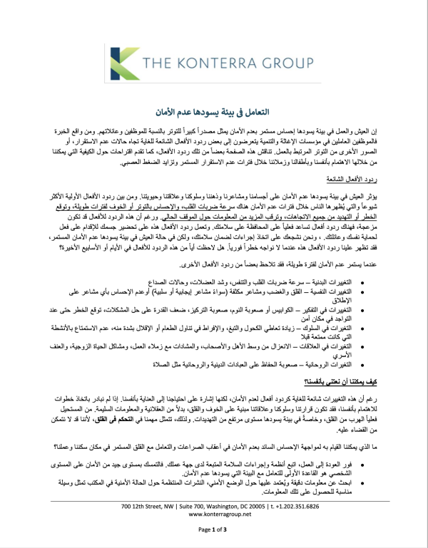 توضح هذه النشرة ا كيفية التعامل مع الضغوط الناتجة عن العيش أو العمل في بيئة غير آمنة. وتتناول بشكل عام أربعة محاور رئيسية: ردود الأفعال الشائعة التي قد تظهر في مثل هذه الظروف، كيفية العناية بالنفس، كيفية العناية بالأطفال، وكيفية العناية بالآخرين ودعم بعضنا البعض.