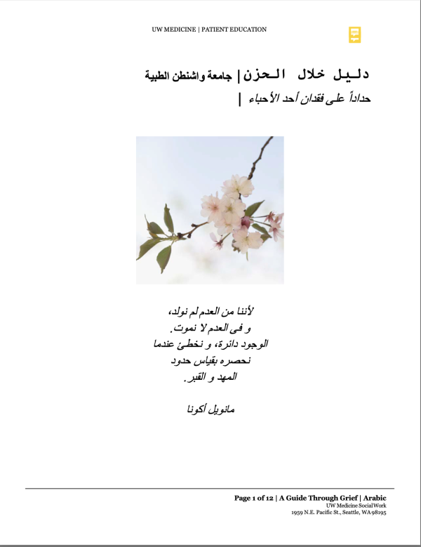 دليل داعم للتعامل مع الحزن على فقدان شخص عزيز. يشرح أن الحزن استجابة طبيعية يمر بها الفرد حسب ثقافته وشخصيته، ويشدد على أنه لا "طريقة صحيحة أو خاطئة" للحزن. يتناول التغيرات الجسدية والعاطفية والسلوكية، ويعطي نصائح للاعتناء بالنفس، الدعم الاجتماعي، إشراك الأطفال في التلقي، واستخدام وسائل مثل الكتابة والتذكارات كوسائل علاجية. الفرص المتاحة لتعزيز التعافي تتضمن الحفاظ على روتين يومي، طلب الدعم المهني عند الحاجة، والاعتراف بالتأثير العميق للحزن.